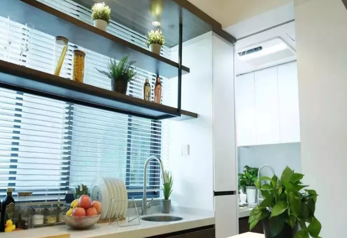 改造后,廚房被分隔出了中西廚兩個空間,解決了烹飪時的擁擠問題。設計師為業主考慮了大金高耐久廚房用嵌入式室內機。小蔡在做中式爆炒菜肴時常常汗流浹背,很是煎熬;妻子小青擅長的西式甜點更需要恒溫的環境來保持食材的新鮮,這款廚房專用空調可以定點清涼科學送風,使人倍感舒爽。抗油污面板和濾網,能保護機器的長久使用。